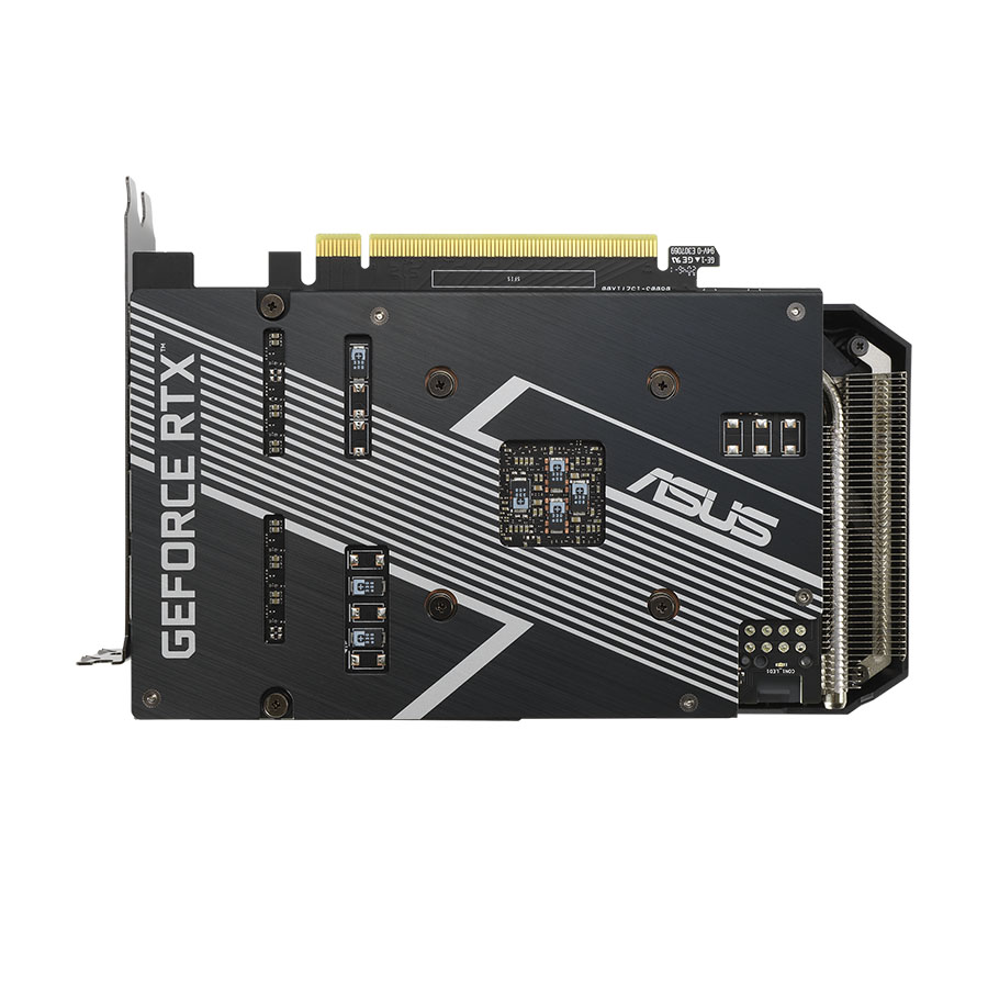 Mặt sau của card VGA Asus Dual RTX 3060 OC 12GB còn có tấm ốp bảo vệ. Nhằm đảm bảo các thành phần trên bảng mạch không bị cong vênh, không bị bụi hay nước vào. Do là tấm kim loại nên ốp còn có tác dụng phân tản nhiệt, giúp card luôn đảm bảo độ mát ổn định.